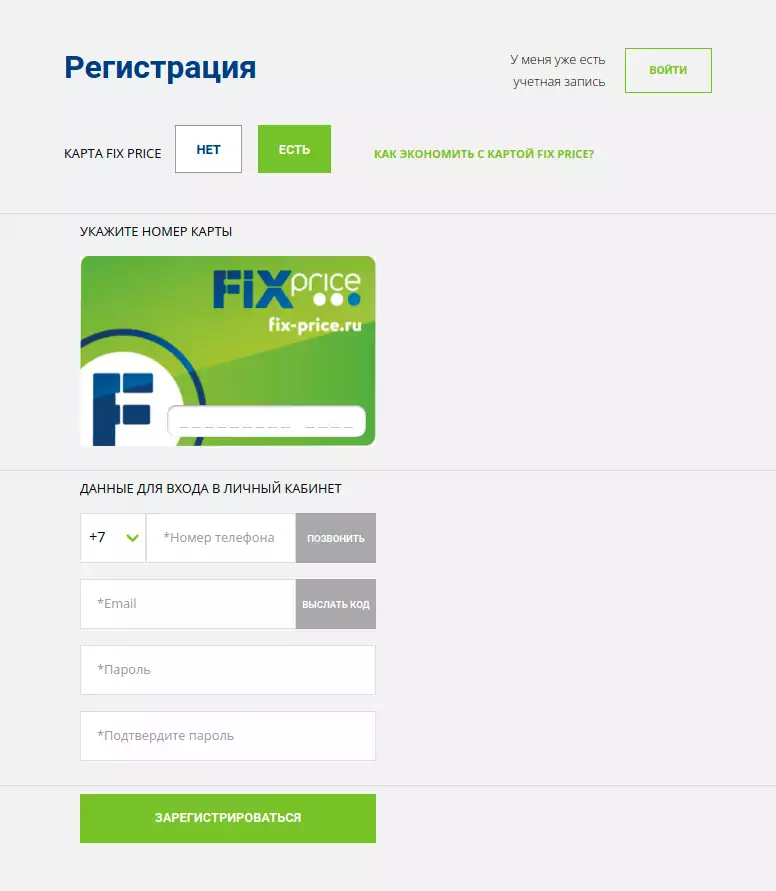 Чтобы начать получать бонусы необходимо зарегистрировать Вашу карту в личном кабинете сайта FixPrice. Для этого на главной странице нажмите на ссылку "Войти" и на открывшейся страничке нажмите кнопку "Зарегистрироваться". Перед Вами появится форма регистрации в которой необходимо заполнить Ваши контактные данные и данные Вашей бонусной карты.
